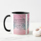 This two-tone mug showcases a design that features a Vintage Moon font with black letters displaying the "Ecclesiastes 12:13-14" KJV bible scripture verse over this picture of a collection of trees in the woods with grayish coloured trunks and pink leaves on the trees and throughout the ground in background of this faith based theme. This verse is referencing the Book Of Ecclesiastes 12th chapter showing verses 13 through 14 in this bible scripture quote theme from the King James bible. The rim & handle are glazed in matching colours available in 11-ounce or 15-ounce sizes microwave and dishwasher safe ceramic construction.