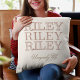 Triple name repeat monoline design with bold centre text adds layered flair. A script phrase "Uniquely Me" anchors the look. Neutral background with dusty clay highlight for a soft minimal tone. Clean type focus on a cream throw pillow layout.