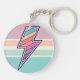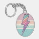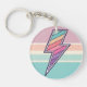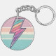Ce porte-clés accrocheur présente un éclair audacieux rempli d'un motif de rayures de coucher de soleil dans un style rétro groovy. Le design combine un symbole puissant avec une palette de couleurs vintage douce, le tout dans un cadre circulaire avec une texture mouchetée subtile.