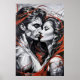 An intense kiss between two faceted, geometric faces—skin fractured into planes of light and shadow—while crimson ribbons flow like blood, passion, or fate. The stark contrast of monochrome and vibrant red creates dramatic tension. A powerful artwork for fashion, film, literature, or emotionally resonant luxury brands.