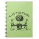 Illustration vintage montrant deux hommes avec un jeune arbre dans un pot + un lettrage traditionnel : "Sauvez les arbres" (non personnalisables). Carnet de notes à spirale personnalisable. Vous pouvez facilement ajouter le texte et changer la taille et la position de l'image en cliquant sur le bouton de personnaliser.