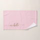 Ensemble de serviettes de bain rose poudré personnalisées avec monogramme doré élégant et chic moderne. Ce design délicat présente un nom personnalisé dans une calligraphie (ou typographie) à la main en cursive avec un enjolivure en or sur fond rose poudré ou rose bébé. Cadeau de pendaison de crémaillère féminin et stylé, également pour un anniversaire, un mariage, une douche de mariée, la fête des mères, une fête d'anniversaire pour les 16 ans, une soirée bachelorette, un cadeau d'anniversaire de mariage et pour une fête de remise de diplôme et c'est pour la fille qui aime les choses élégantes et stylées.