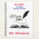 Ce grand carnet est mis en place comme planificateur pour l'année scolaire d'un enseignant - mettre facilement à jour le texte du titulaire de place sur le devant. Il dispose d'un stylo à écriture démodée couplé à un livre ouvert. La phrase accrocheuse dit "Écrivez !"