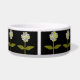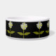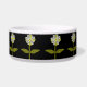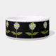 Ce magnifique bol d'animal de compagnie présente l'image numérique d'une marguerite avec une tige verte avec deux feuilles verts et des pétales blancs et jaunes avec un centre jaune. Les pétales ont l'air de briller d'une belle qualité réfléchissante. La fleur est sur un arrière - plan noir pour un contraste maximum et le résultat est stupéfiant.