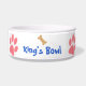 Nous savons qui gouverne la maison - Ce grand bol de chien présente une illustration originale de ZoeSPEAK d'une couronne dorée faite d'os de chien et d'empreintes de pattes. Il y a aussi quatre empreintes de pattes de chien roses autour du bol blanc, et les mots "DOGS RULE !" en bleu. Entre deux des empreintes de pattes se trouve le texte en bleu qui dit "King's Bowl". Il s'agit d'une personnalisation avec le nom de votre chien ou tout ce que vous voulez.