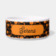 Ce bol à chien personnalisé présente un mignon citrouille éparpillé et des pattes motif avec citrouilles orange et des pattes sur un arrière - plan noir. Parfait pour Halloween et toute la saison éffrayante d'automne. Ajoutez une touche d'automne au repas de votre animal avec ce bol monogramme pour chien. Personnalisé avec le nom de votre chien en script noir sur un arrière - plan orange coordinateur. Joyeux Howloween !