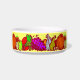 Ce design présente un Collage de Thanksgiving de fruits et légumes tels que dattes, navets, raisins, pommes, citrouille et plus. Un dossier de couleur jaune a été ajouté à cette conception. Conçu pour que votre animal puisse célébrer les fêtes avec vous. Ces bols sont disponibles pour un chien ou un chat.