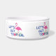 Ce bol pour chien avec un graphique amusant et mignon "Allons-y tropical" avec des flamants roses est parfait pour votre animal de compagnie. Conception d'Inge Lewis. Cadeaux formidables pour votre famille, vos amis ou vos invités. Trouvez plus d'articles correspondants à la boutique ingeinc.com.