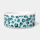 Ce bol pour animal de compagnie bleu a un motif d'impression léopard créé numériquement avec un nœud papillon pour chien qui comporte une zone de texte personnalisable à l'intérieur pour le nom de l'animal.