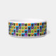 J'aime les carrés de carrés de couleur de carlins bleus, pourpres, d'orange et de chaux avec le faon et les carlins noirs. La cuvette parfaite de chien pour votre carlin !