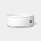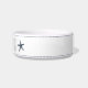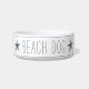 Un bol pour chien de style côtier mignon pour votre maison de plage ou résidence insulaire comporte les mots "chien de plage" dans un lettrage de style ferme de Harbour bleu fumé sur fond blanc accentué de fines rayures bleu marine et une paire d'étoiles de mer.