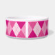 Motif de style argyle dans une palette de couleurs roses. Il y a également une bannière en forme d'os de chien noir avec une zone de texte personnalisable pour le nom de l'animal.