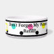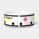 Personnaliser le nom de l'animal en noir à l'intérieur d'une zone encadrée jaune. Une citation humoristique 'N'oubliez pas de remplir mon eau' est écrite sur le côté opposé du nom. Des pois géométriques colorés avec une bordure noire et des points roses, jaunes, turquoise, noirs sur fond blanc. Œuvre originale et conception de citation © TamiraZDesigns.