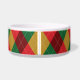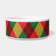 Motif argyre coloré et festif dans une palette de couleurs rouge, verte et jaune. Il y a également une forme d'os de chien rouge qui comporte une zone de texte personnalisable pour le nom de l'animal.