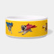 A dog bowl feauring seven superhero dogs in flight. The superhero dogs are Border Collie, Chow Chow, Dachshund, Golden Retriever, Beagle, Bulldag, and Airedale Terrier.