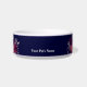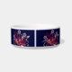 Ce dessin est un tatouage de nombreuses fleurs, feuilles et vignes différentes. Quelques papillons volent autour des fleurs. Les couleurs du tatouage sont de couleur rouge avec un soupçon de pêche. Le bol d'animal a 4 fleurs, 2 de chaque côté. Votre nom d'animal de compagnie peut être placé sur le devant de ce plat. Un dossier bleu foncé a été utilisé.