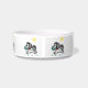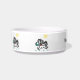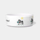 Un bol pour animal de compagnie en céramique blanche moyenne, avec la possibilité de personnaliser = " Le nom de votre chien ici ! avec des dessins d'un chien de dessin animé, Tiffany et son Frisbee, = 4 fois autour du bol, = (Œuvre de P.J.M.).