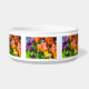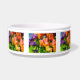 Violet coloré, violet, tulipes roses sur un lit à fleurs. Presque toutes les couleurs arc-en-ciel présentes. Scène florale lumineuse et positive. Écuelle pour animaux.