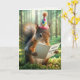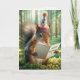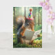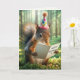 Un écureuil se tient dans une forêt éclairée par le soleil, portant un casquette de fête festif tout en tenant une carte d'anniversaire. Le texte intérieur peut être modifié.
