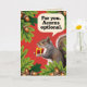 Un écureuil roux se cramponne à un petit paquet cadeau, entouré de feuilles de chêne et de glands sur un fond rouge vif.