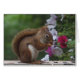 Cette carte de note comporte un écureuil rouge adorable ayant un casse-croûte des graines de tournesol avec un arrière - plan des pétunias roses et blancs et de la belle verdure. Une plus petite image du même écureuil est à l'intérieur.