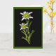 Pretty graphic artwork of the Alpine flower called Edelweiss. Set against a jet black background, with a green edge around the card, you can almost feel the fuzzy softness of the flowers petals. Text inside is fully customizable to suit your needs. Great for every day notes to special occasion cards.