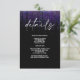 Modern Abstract Details insert - with QR code on back for further details - Bold edgy Purple sparkly garland cascades down the page, in handwritten calligraphy is "details" - the rest of the text is simple and clean - all on a black background. Elegant wedding stationery. This is part of a complete Wedding Stationery Suite. Easy to customize template. Original artwork © by WhimsicalArtwork™.
