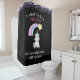 A shower curtain with a unicorn drawing. A shooting star above it's head. . Pink and purple watercolor confetti decorate the top border. The