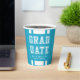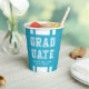 Varsity graduate paper cups with editable background colour (click customize, go to the "Auto Warping, Wrap" layer and change the background colour). This a great way to match your cups to your school or favourite colours.
