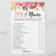 Purchase this floral game and enjoy high quality Ever or Never card for your event! How well do you know the birthday girl? Flowers design.