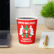 Elegant paper cups for your company Christmas party featuring a modern watercolor of pine trees in sage green, red, "Happy Holidays" in a stylish script and your business name in simple typography.