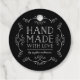 Stylish tag with the words "Hand Made with Love" between flourishes all in white against an editable background colour (click customize to change). This tag is great for crafters and makers of handmade goods, like artists, knitters, dressmakers. It can be used when gifting your handmade goods or as product tags