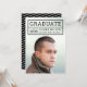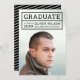 Modern photo graduation announcement card with the graduate's details within a grid. Card has a white stripes pattern against an editable background colour (click customize to change) back side.