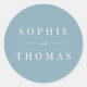 This wedding sticker features the names of the wedding couple in white against an editable background colour; to change it from dusty blue to a colour of your choice, click the customize button.