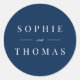 This wedding sticker features the names of the wedding couple in white against an editable background colour; to change it from blue to a colour of your choice, click the customize button.