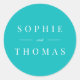 This wedding sticker features the names of the wedding couple in white against an editable background colour; to change it from turquipse to a colour of your choice, click the customize button.