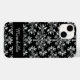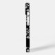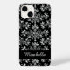An editable iPhone case with elegant script letters in white on a black ribbon and a floral damask pattern in back on white.