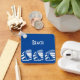 A custom beach, pool or slip editable key-chain with art deco letters and a pattern of white sailboats sailing across windy ocean waves, on a deep blue background.