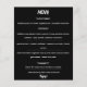 This editable elegant menu in black and white features dining options. There is an editable field on the back for additional information, as well. Change the details, add prices, change categories etc and change the font style, size and colour. The background colour on both sides can be changed, too. Use this for weddings, anniversaries, retirements, engagements, birthdays or for business purposes such as catering, restaurants etc.