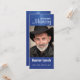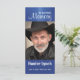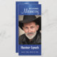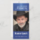 This editable photo bookmark memorial card features a photograph of a man (you will substitute your own photo of your loved one here) and a message above. Below, is the person's name and dates of birth and death. On the back is a verse. The text on both sides is editable so go ahead and change the messages and information as well as the font style, size and colour. The text and photo are set against a dark blue background with rays of light from above. This is perfect for a funeral or for a celebration of life.