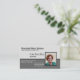 This editable business card features a two-toned design. To the right is a portrait and there is information about the company and employee on the card. On the back, there is a field for additional information.