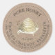 Great editable kraft vintage honey label. Text reads, "Pure Honey," with the beekeeper's name. Central illustration of a vintage skep hive. Ideal for beekeepers and honey sellers. Subtle gold border.