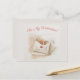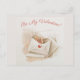 This editable postcard features a vintage drawing of a cute cherub peeking from an envelope. In this illustration, an adorable cherub with blonde curls and rosy cheeks has torn the red wax seal of the envelope and lifts up the flap with a chubby arm. Several sheets of paper rest underneath. The background is a pale pinkish white watercolour.
