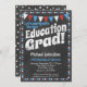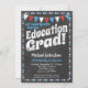 A fun and unique education graduation party invitation in chalkboard style with red, white and blue flags and a whimsical polka-dot border with dots on the back.