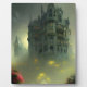 Eerily beautiful AI generated digital art tabletop plaque features a dark and ominous Gothic mansion on a foggy night. Perfect for Halloween!