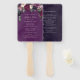 Romantic flowers in shades of rich burgundy, gentle lilac, deep eggplant purple and pinkish orchid pair with modern green botanicals such as ferns and eucalyptus. A deep, eggplant purple watercolor background ties it all together with elegant typography in these romantic wedding program hand fans.