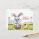 A Happy Easter postcard: it comes with a pastel colours illustration of a chick, a bunny holding a basket filled with eggs, in a meadow with flowers, reminiscent of spring.