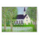 Pastel d'une église blanche de pays sur une colline. Un étang près de lui reflète les bleus, les rouges, les jaunes, les oranges et les pourpres des fenêtres en verre teinté.