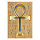 The Egyptian Ankh symbol or Key Of Life in gold tones and blue. The Ankh in the centre of the design is complimented by smaller Ankh symbols around it on a papyrus background design.