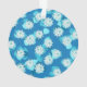 A stylized, Art Deco pattern of lotus flowers in cobalt blue and white on a turquoise blue background